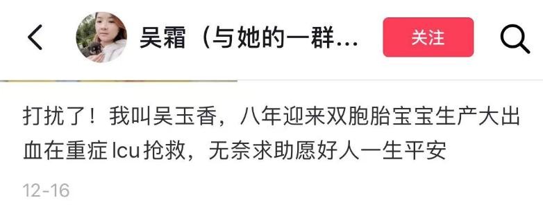 12月16日,吴霜在生产时出现大出血,医生对其进行了紧急抢救,耗费无数心力才暂时稳住情况不至于恶化,接着吴霜被送往重症监护室进行观察和接受后续治疗。