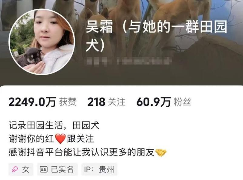 据了解,吴霜原名吴玉香,贵州人,拥有60万粉丝,是一位名气不小的网红,她在老家养了一条田园犬,日常就是和网友分享贵州农村里的田园生活。