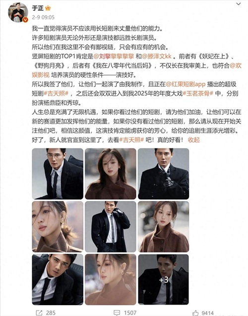 对刘擎和滕泽文表示认可,并且列出了他们的代表作品,签约他们来参演自己制作的短剧,