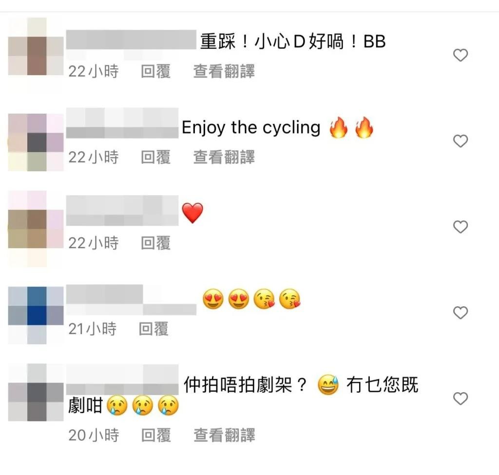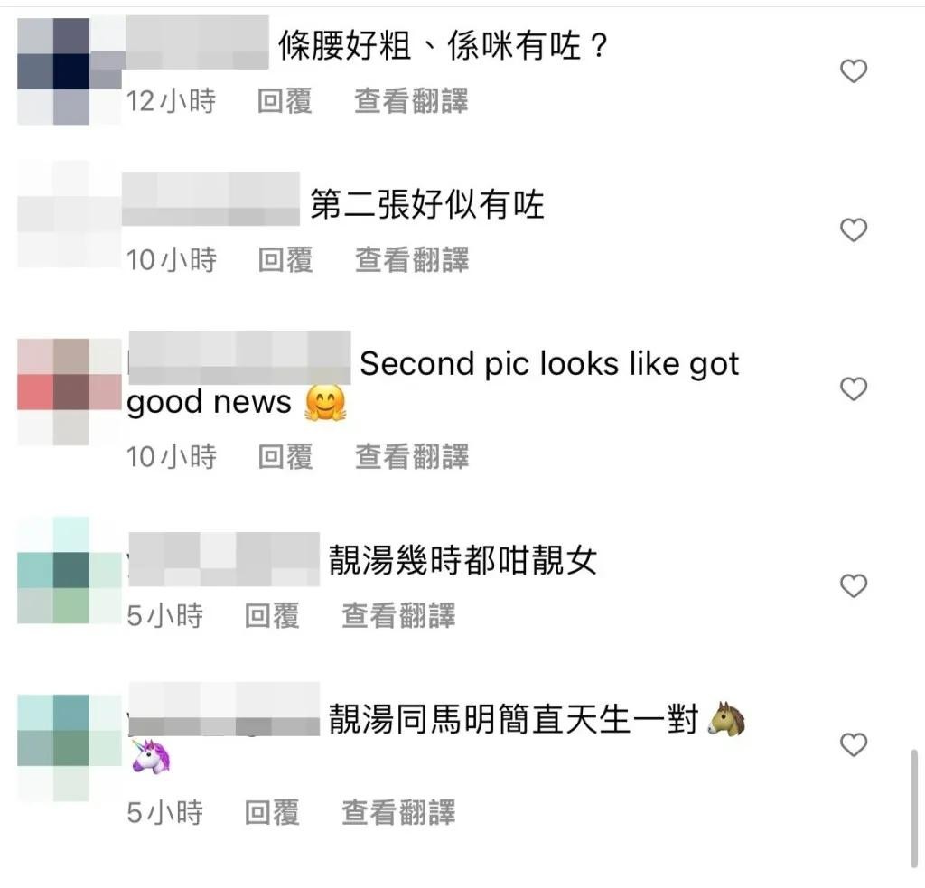 其中一张照片中,靓汤疑似肚子凸凸,令不少网友都纷纷留言猜测她是不是有喜:“条腰好粗,是不是有了?”、“还踩(单车)!小心点好哦!BB!”