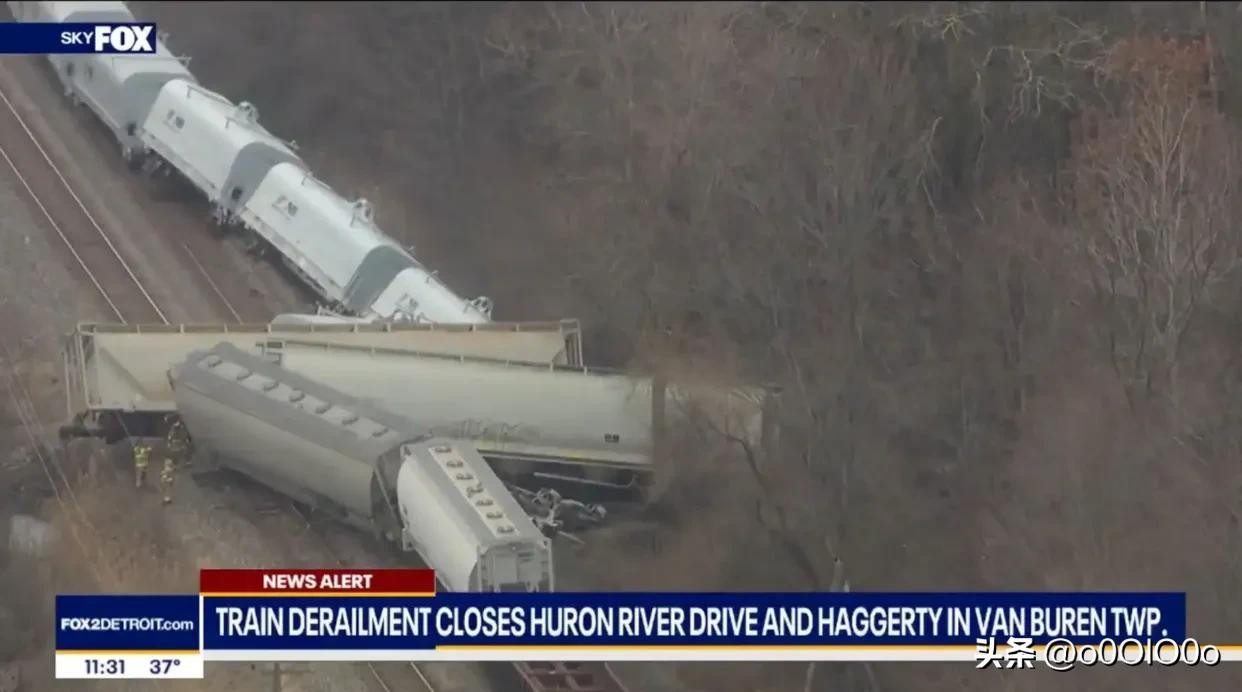 当地时间2月16日,美国一列载有危险材料的火车在密歇根州底特律郊外的范布伦镇脱轨。列车脱轨的原因尚不清楚