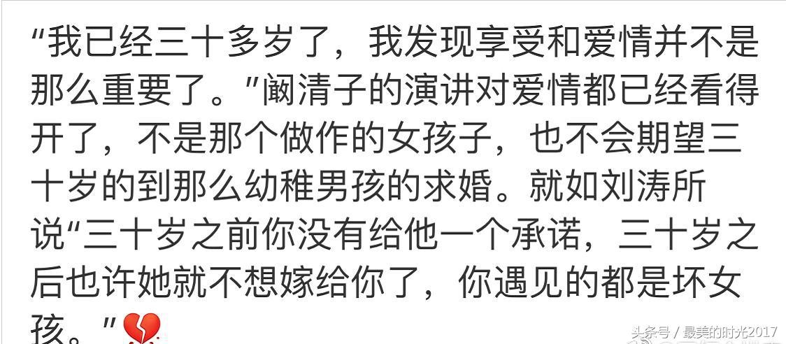 有点心疼阚清子,不管怎么样你能说出这句话就表示你伤透心,不用问分手的原因也不需要诋毁任何人。你一定能找到那个珍惜宠爱关心呵护爱你并且把你当个孩子的好男人。