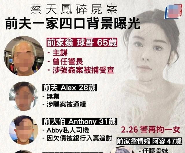 蔡天凤与前夫在 18 岁结婚、21 岁离婚,次年与 " 谭仔 " 创办人之子 Chris 再婚,两段婚姻分别生下一双子女。蔡天凤在 2025 年出资 7000 多万购房,供前夫一家居住,为节省印花税以前公公首次购房的名义买下,去年计划出售与男方一家发生争执,前公公遂主谋将其残忍杀害。