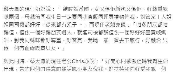 蔡天凤好友受访透露,在她的维系下,三个家庭相处融洽,公公婆婆视前任女子如己出,甚至与前公公婆婆关系不错,曾一同到访慈云寺拍合照。蔡天凤公婆及丈夫透过好友转发公开信,称赞死者的为人,视其为宝贝女儿,丈夫还承诺会照顾好四个子女。