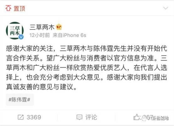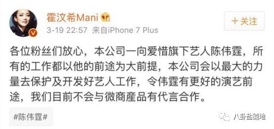 随后,经纪人霍汶希出面发微博澄清,表示本公司一向爱惜旗下艺人陈伟霆,目前不会与微商产品有代言合作。