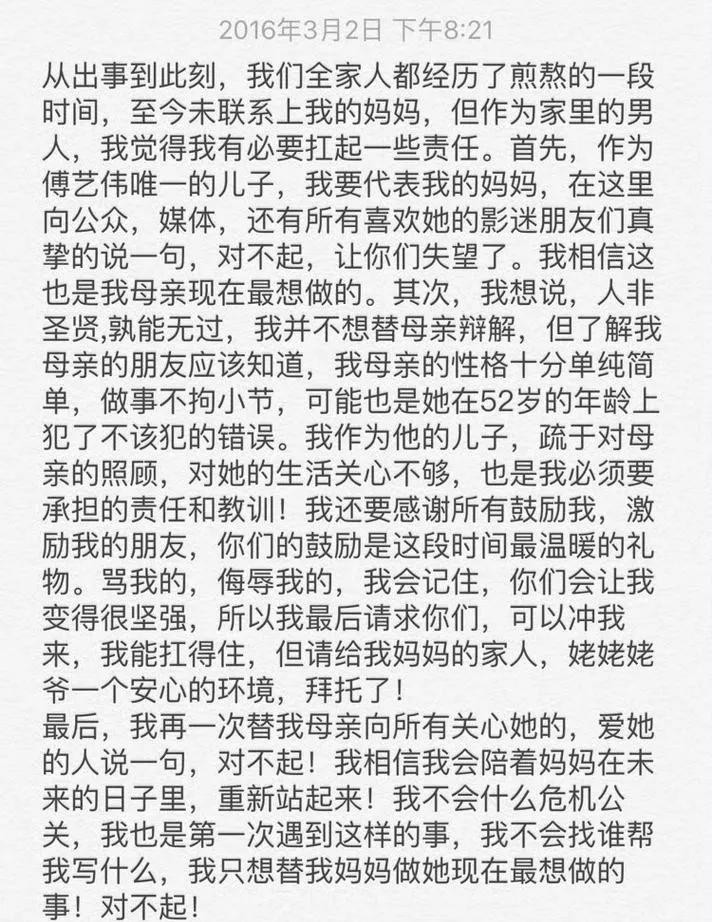 吸毒行为严重损害了傅艺伟的形象和声誉。但儿子的支持和陪伴成了她戒毒和重建生活的动力。