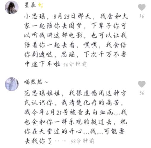 范思瑶,我被你深深地感动了。 在那里一定要站稳。 你可能现在不在这个世界上,但是如果你还认识我的话,我想告诉你,每天都是你开心的时光。 即使你得了更重的病,我也希望你每天过得开心。