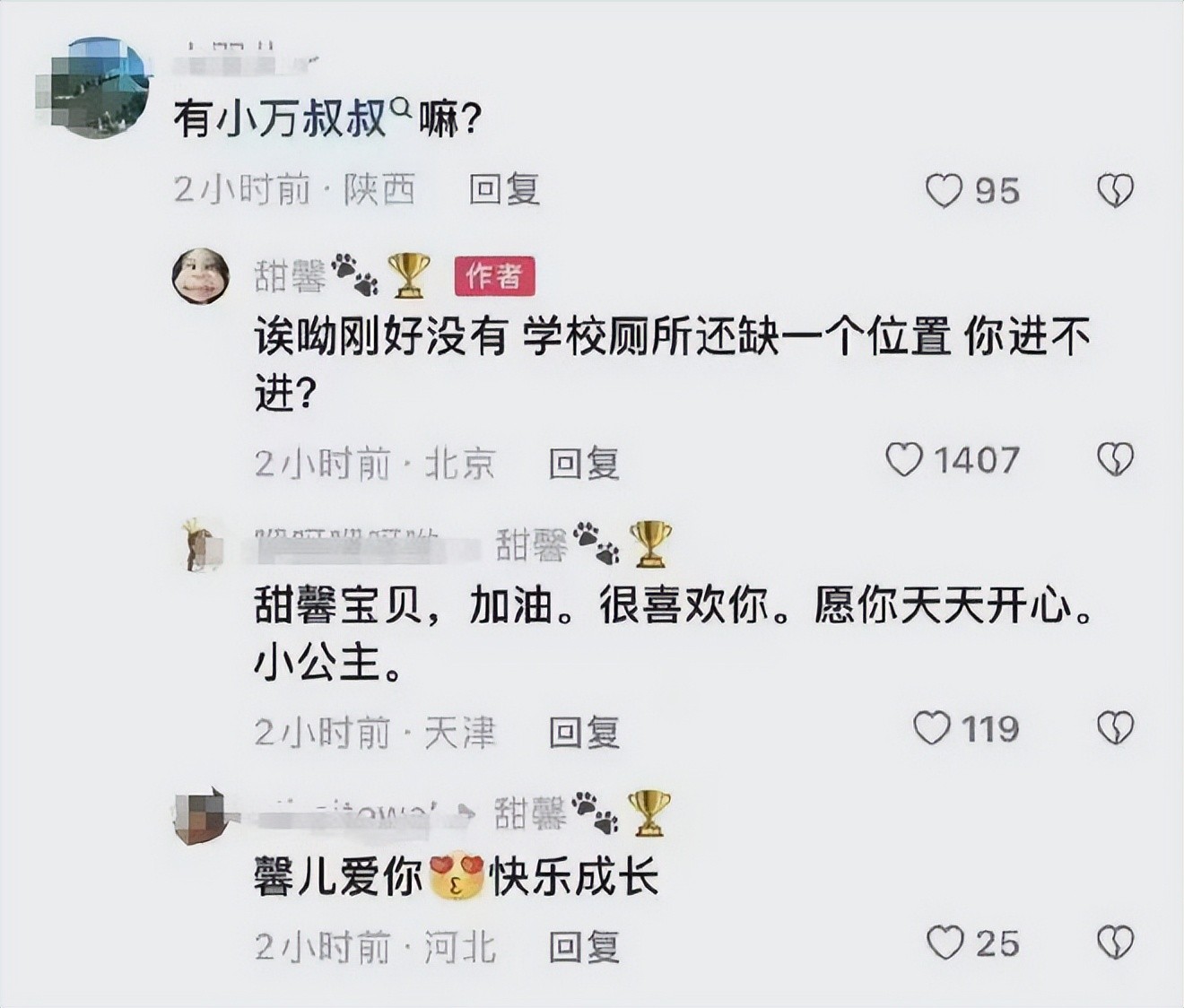甜馨也会在别人攻击妈妈的时候勇敢地站出来回应,毕竟那些说到孩子评论区来的人真的很没品。