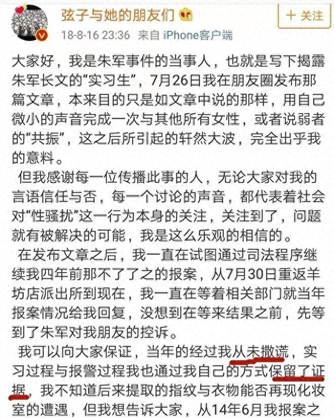 直到2018年7月,在美国掀起的米兔运动影响下,弦子在朋友圈再次提起当年的报案,并由她的好友徐超(网名麦烧)转发到微博上。