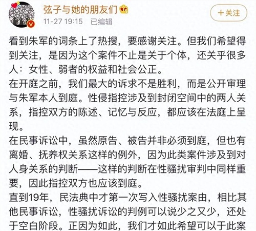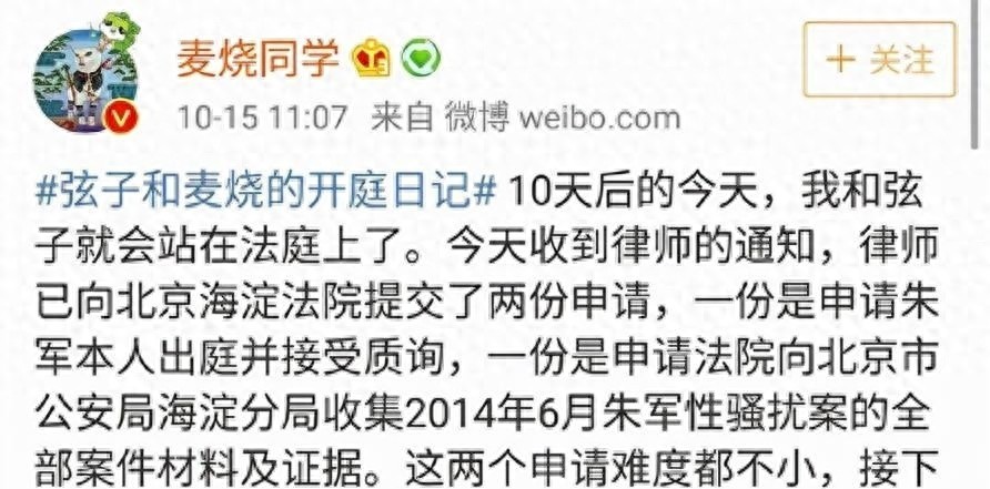 与此同时,弦子也正式起诉朱军,要求朱军赔偿精神损失费10万元,并公开道歉。
