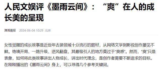 参考资料:潇湘晨报 2024 年 06 月 04 日——人民文娱评《墨雨云间》:" 爽 " 在人的成长美的呈现