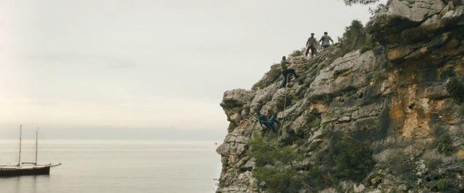 他们从悬崖攀爬到德军防备薄弱的方位,在侦查地形后,先由肌肉男用弓箭无声射死岗哨里的德军,突击小队再剪断铁丝网进入据点。
